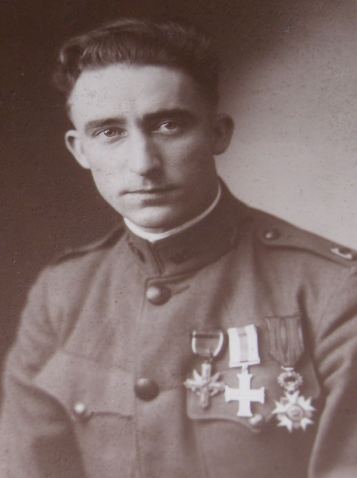 World War I: Commanded Co. B, 120th Infantry. This unit was in the forefront of the combined arms assault which broke the Hindenburg Line at Bellicourt, France, September, 1918. Distinguished Service Cross (US); Military Cross (British) presented to him at Buckingham Palace in January 1919 by King George V.; Chevalier of the Order of the Crown (Belgium). Purple Heart --German mg. bullet pierced right forearm near St. Souplet, France, October 19,1918, three weeks before the Armistice.