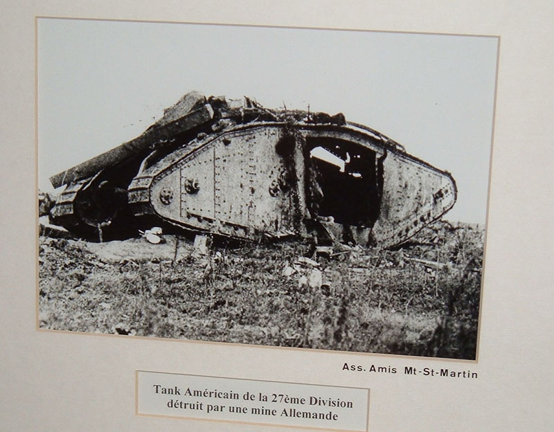I tried to attack again but without success. Immediately, I dispatched a message to headquarters, stating we were held up and needed assistance. Presently I saw, about a mile away, a British tank moving in a direction just south of us. A runner was sent there to ask his assistance, which he willingly gave, starting in our direction. We watched the machine dart into the bushes, pushing down everything in its path and soon disappearing. In five minutes I heard the tank's Hotchkiss guns firing, and I knew the enemy were taken. I went in the path of the tank and found one officer and forty two Germans with their hands up. They had eight machine-guns in addition to their rifles and other equipment. Twelve of the men had been wounded by the tank's gun, and we let the well men care for the wounded. The German officer was very polite He stepped out and saluted as I came up.