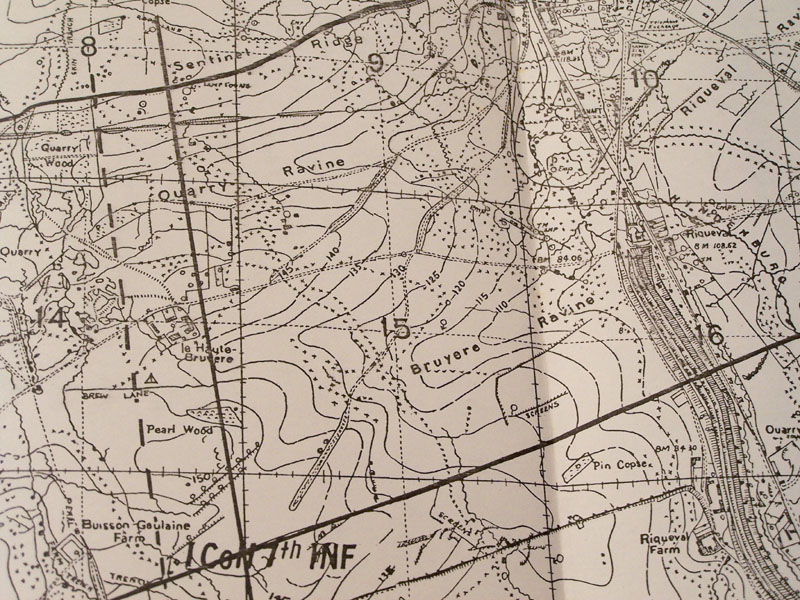 When I was nearly finished with the can of milk, a runner came up and reported I was wanted at Headquarters again. I crawled out and took a runner with me. When there I was given a cup of hot coffee which tasted better than any I have since had. The orders were that we were going over the top again at 5:15 a.m. By a little candle light, I read over the maps and orders.