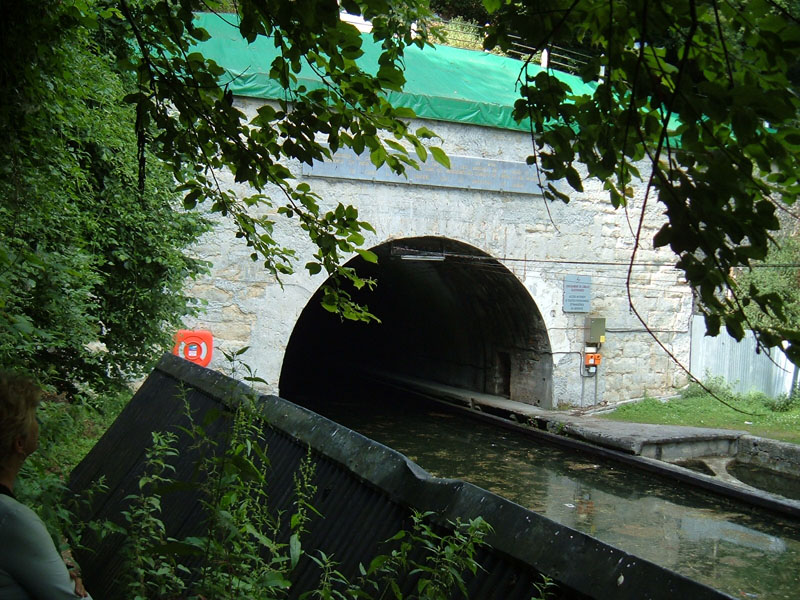We entered the tunnel through a gallery leading down to the walkway alongside of the water. Here we walked for fifteen minutes, guided along the walkway by the light of candles, because the electric lights were not in use. (It later developed that if the electric dynamo had been started, the whole tunnel would have blown up--contact wires were attached to the wheels of the dynamo.) We reached the concrete stairs leading up to the room "where men were made into soap."