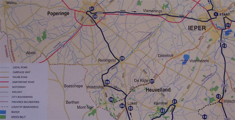 Of interest are (1) Watou (far left), the town to which Dad and his company withdrew while not actively at the front. It still is a small, quaint town. (2) Poperinge, where "R and R" was taken (there is still the now famous Talbot House Dad mentioned, today a museum which we found closed on Mondays), Ypres (IEPER) (see the link to the Ypres pics) and Kemmel Hill (26), where the Germans had very large guns which shelled Dad while at the front, and Ypres. But most important of all, locate Voormezele, where Dad fought at the front lines. Locate N365 at the upper right. This road, now leading directly south out of Ypres, goes right through the countryside where the trenches in which Dad fought were once located. There is now a British Cemetery (12) that was right there.