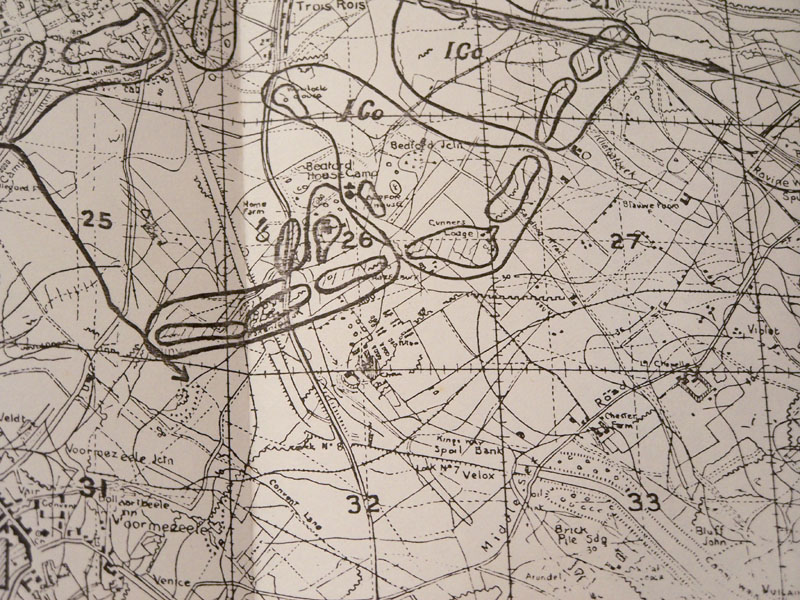 The canal is indicated by the pair of parallel lines extending from NNW through the 2nd trench from the left and continuing into box 32, then turning to the ESE. This is a canal from the north, with a lock (number 8) at the turn to the ESE. The Belgium command, wanting to slow down the Germans during the initial invasion, caused massive flooding (Keegan, 1998) using this canal, among others. It was effective, and remained so throughout the war. Based on the pillbox that still exists, and other factors, Dad's trench was either the 2nd or 3rd trench from the left, determined by his description of "rats splashing in the old canal", partly by the location of the pill box, and his description matching what we found. To give the viewer a sense of the scale, I believe the box size to be 1,000 yards by 1,000 yards. Based on these 3 maps, the location of Dad's fighting can be very accurately located. We were amazed to find most landmarks, including farm houses, as described almost 100 years ago.